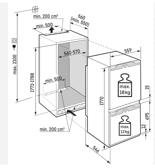 - Max. hmotnost dveří kuchyňské linky: 18kg/12kg