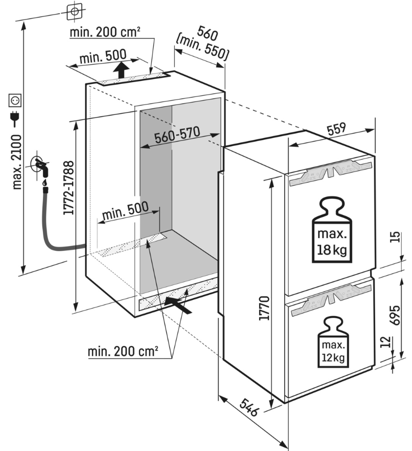 - Max. hmotnost dveří kuchyňské linky: 18kg/12kg