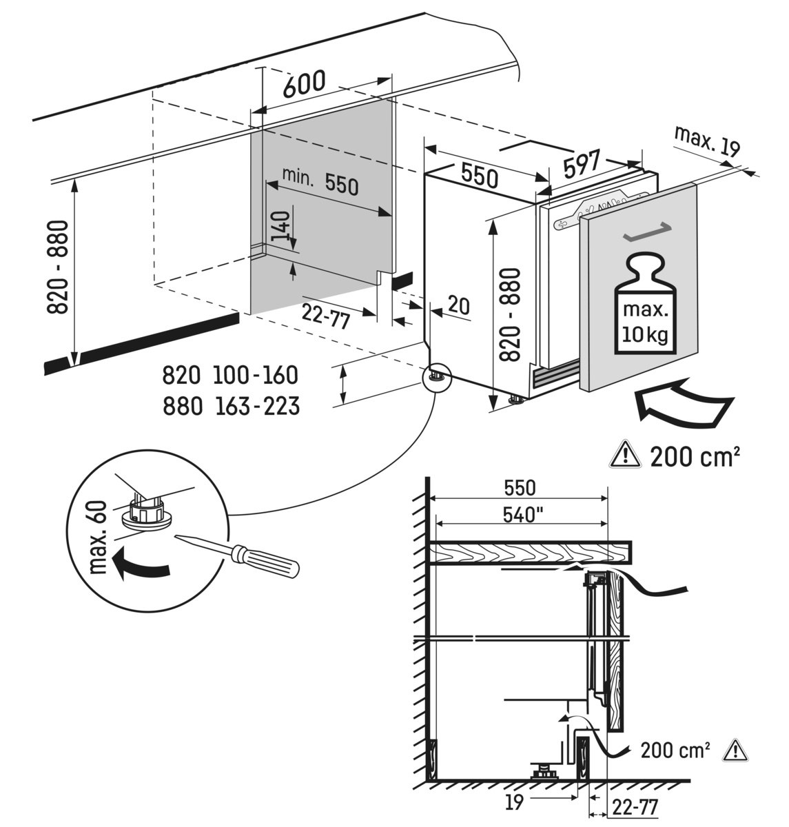 Konstrukční řešení podsady - podstavce umožňuje u podstavných modelů výškové a hloubkové přizpůsobení ke kuchyňskému nábytku. Všechny čtyři stavitelné podpěry lze zepředu nastavit ve výškovém rozsahu 60 mm. Kromě toho může být větrací mřížka přizpůsobena čelní stěně kuchyně v rozsahu 55 mm.