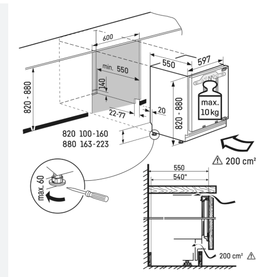 - Max. hmotnost dveří kuchyňské linky: 10