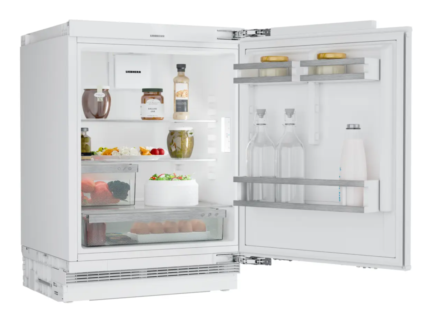 Užijte si ještě vyšší flexibilitu a pohodlí při skladování potravin: Přihrádky na dělených dveřích lze posunout a podle potřeby výškově přizpůsobit. To znamená, že např. plechovky a malé zavařovací sklenice umístíte na bezpečné a snadno dostupné místo. Lišta ve vzhledu nerezové oceli navíc přihrádkám dodává elegantní vzhled.