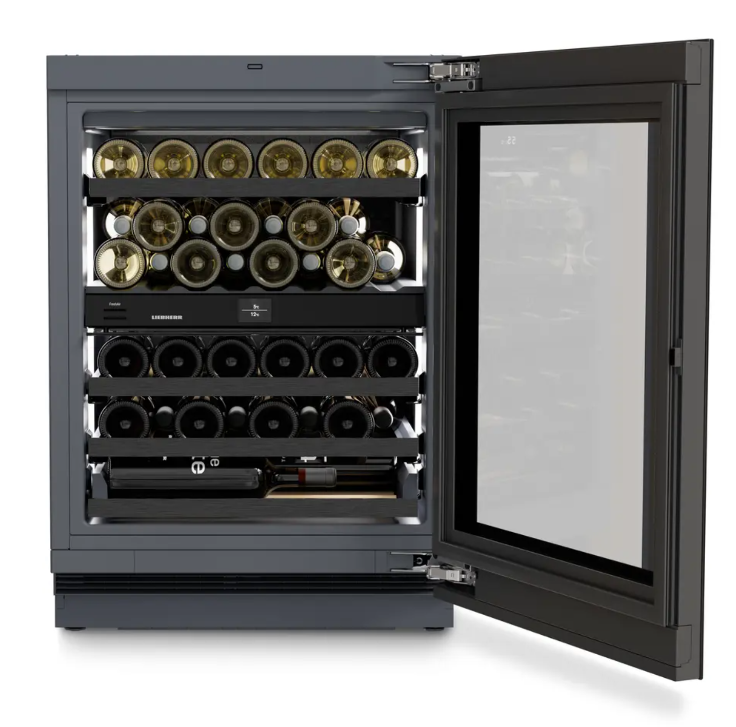 Dvojitá ochrana. Temperovací vinotéky s prosklenými dveřmi nabízí nedostižnou ochranu před UV zářením díky dvěma ochranným vrstvám skládajícím se z tónovaného skla a pokovených vrstev uložených ve vakuu. Takzvaná izolace Low-E zajišťuje pro víno účinnou ochranu před škodlivým slunečním zářením.